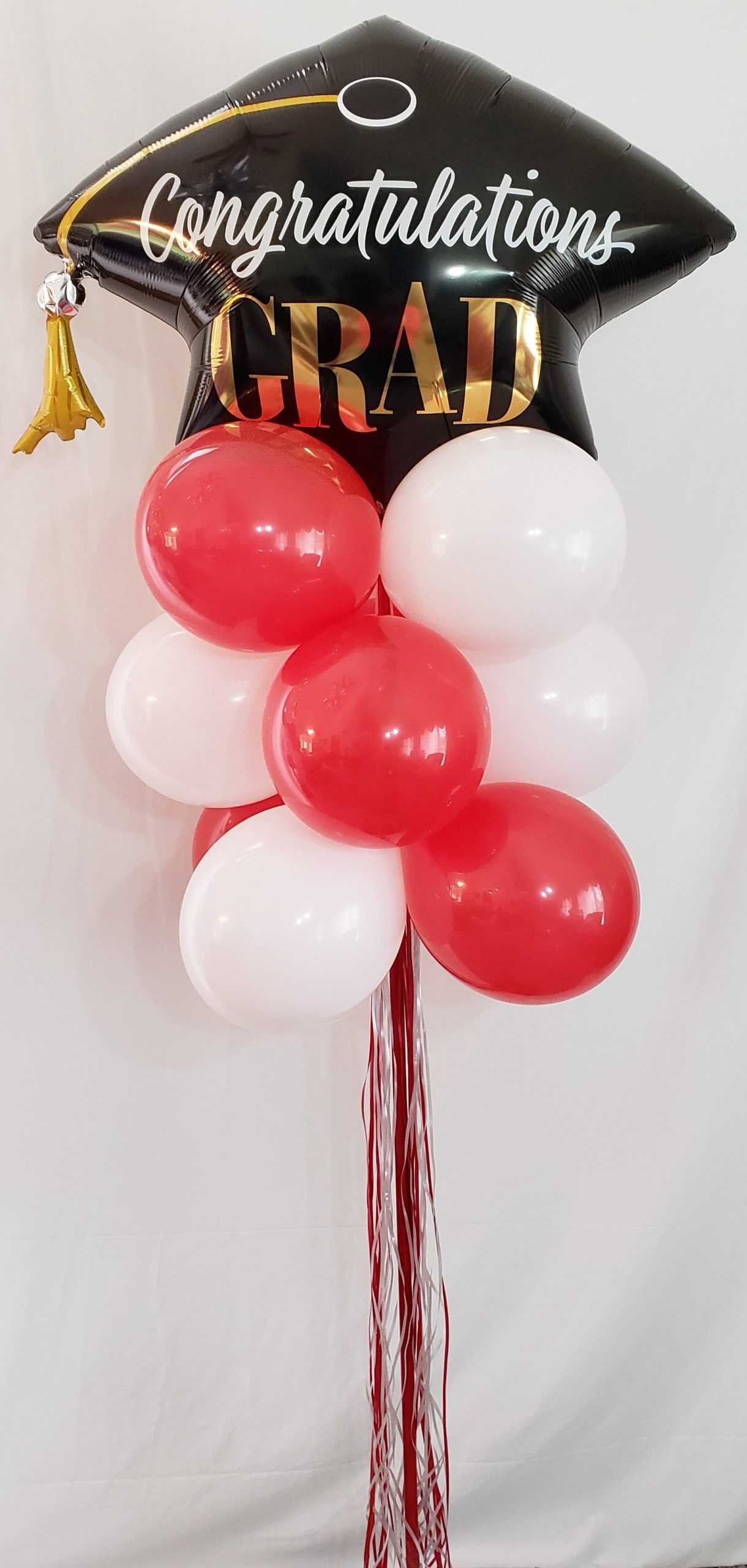 Let us make one these using the grads school colors & topped with this great looking Lg Congratulations Grad balloon that goes with any school colors.